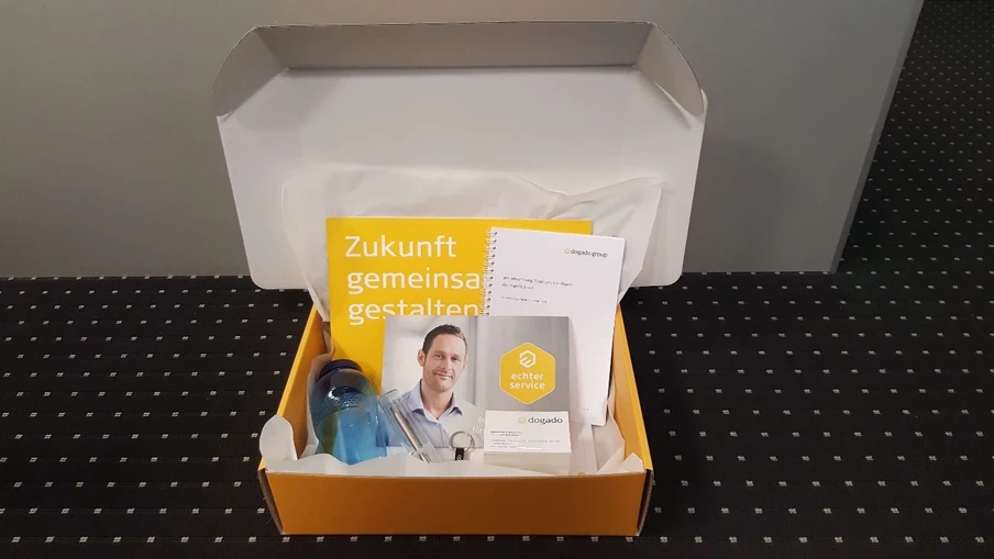 Neue Mitarbeiter werden mit unserer gelben Welcome Box begrüßt.