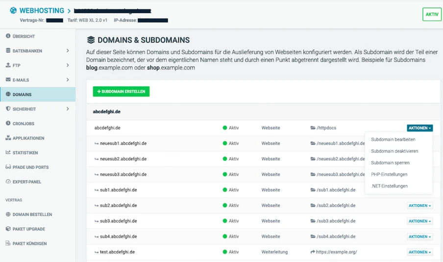 Ausgehend von dieser Gesamtliste kannst du dann in die jeweilige Aktion springen und beispielweise die PHP-Einstellungen ändern oder deine Subdomain bearbeiten.